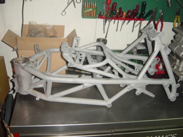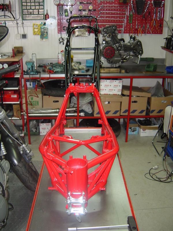 Dolaskom obrađenog, sada crvenog okvira sa crnim stražnjim košem, slaganje je moglo početi. Privremeno smo učvrstili agregat na kojem je još bilo posla ali nam je trebao za montažu stražnje vilice s lancem i amortizera.